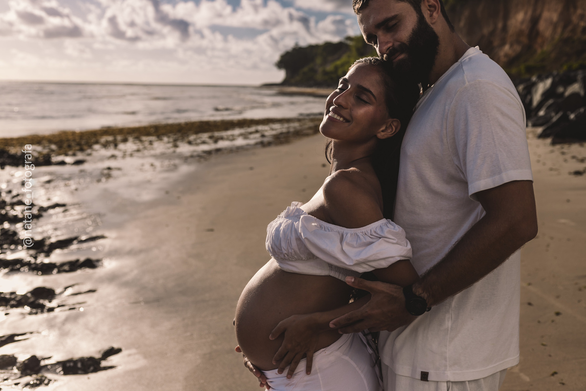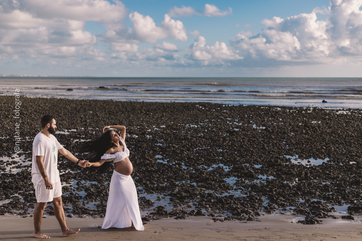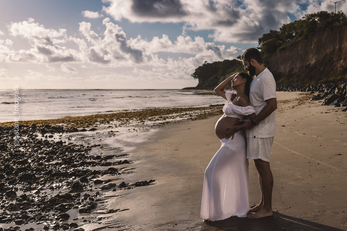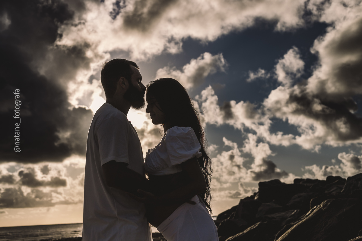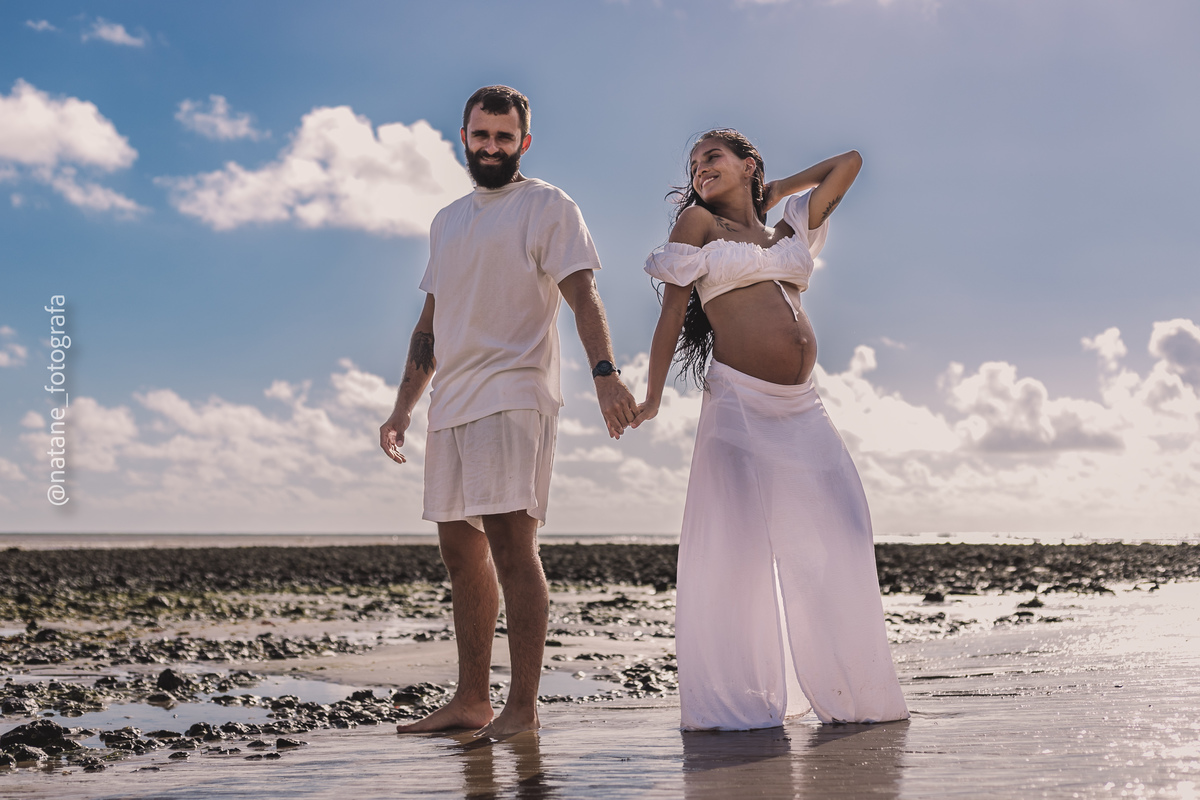 Marcamos o ensaio na praia, e mesmo não sendo exatamente o lugar que ela sonhava, o cenário do Cabo Branco nos presenteou com uma manhã incrível: maré baixa, sol generoso e uma luz perfeita para envolver esse trio, o casal cheio de amor e a pequena Maria, ainda no forninho, mas já tão esperada e querida.