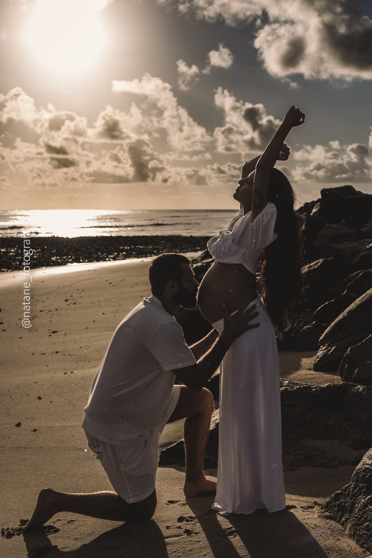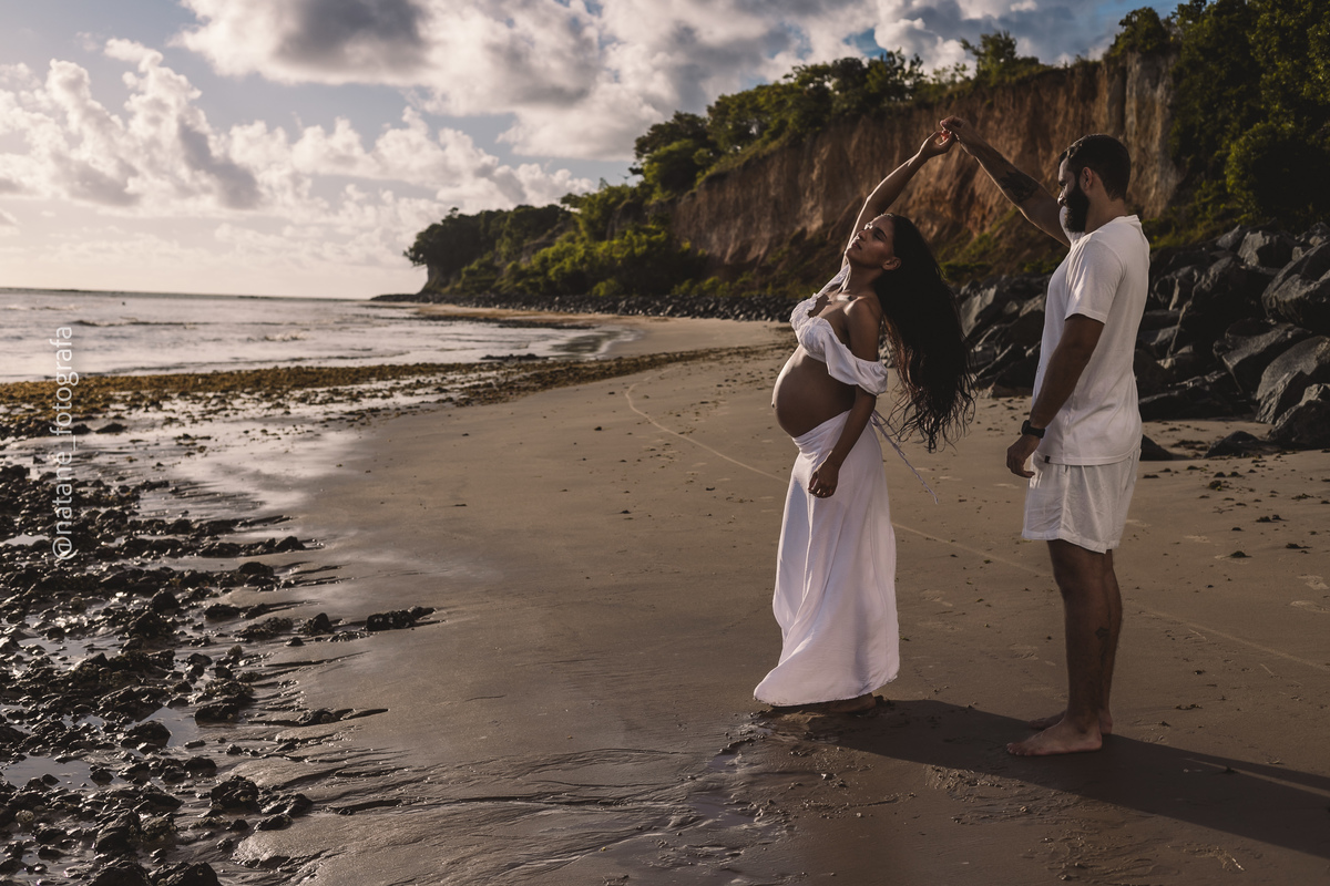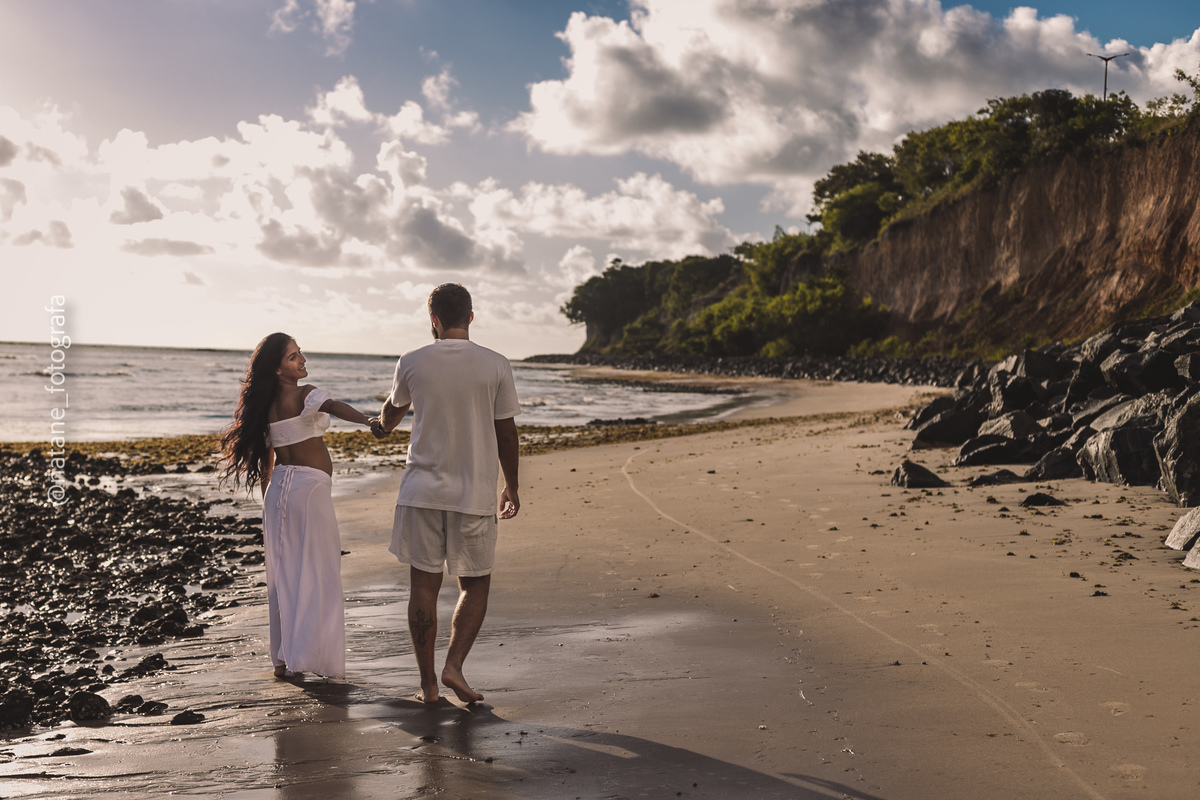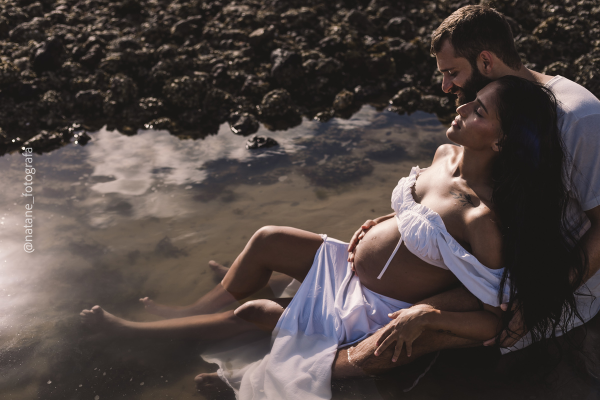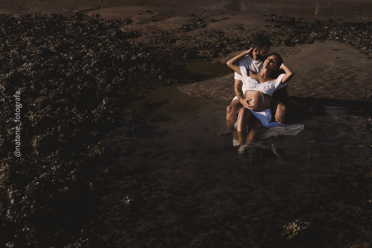 Marcamos o ensaio na praia, e mesmo não sendo exatamente o lugar que ela sonhava, o cenário do Cabo Branco nos presenteou com uma manhã incrível: maré baixa, sol generoso e uma luz perfeita para envolver esse trio, o casal cheio de amor e a pequena Maria, ainda no forninho, mas já tão esperada e querida.
