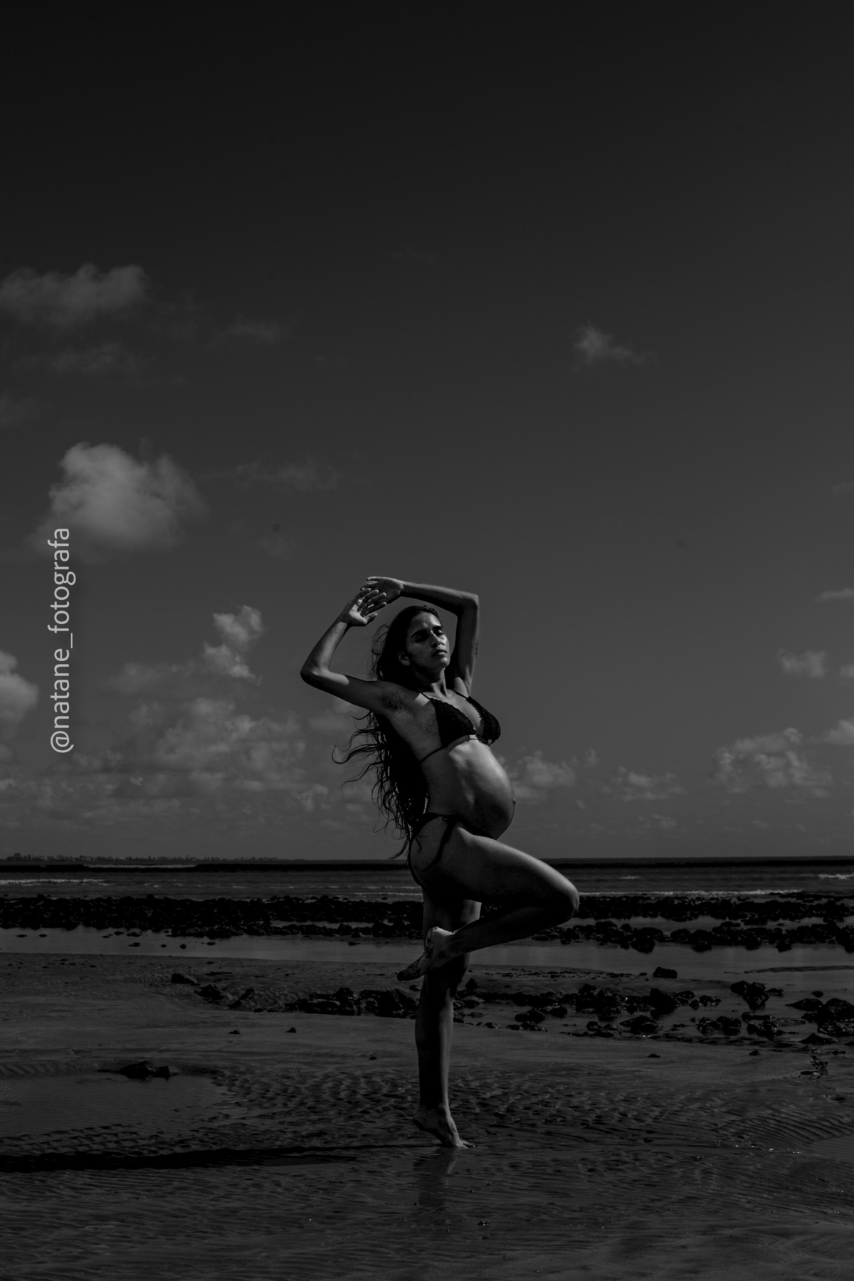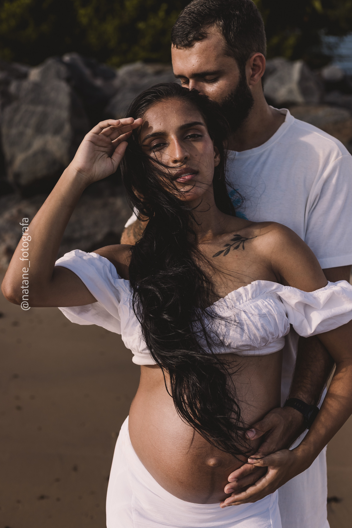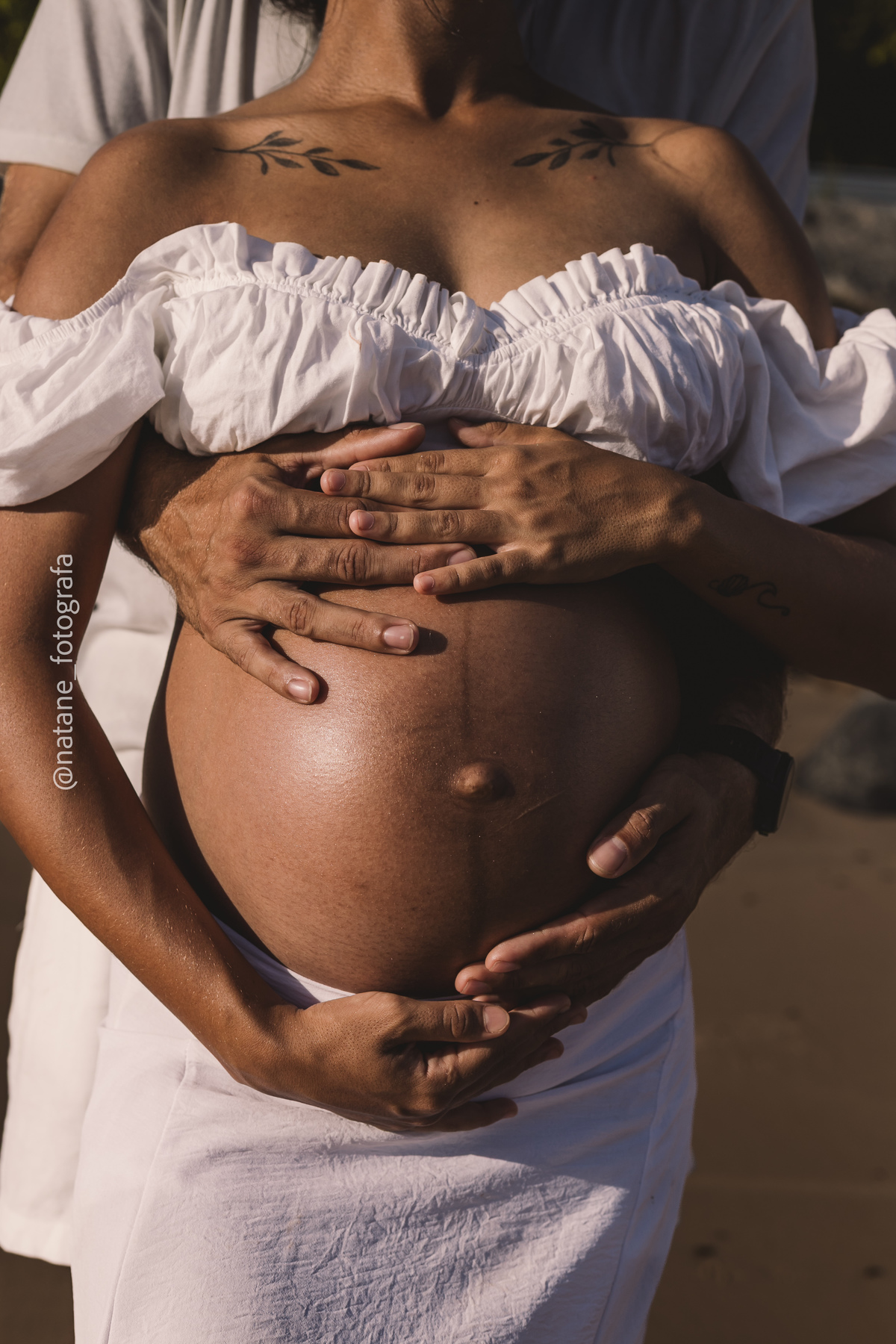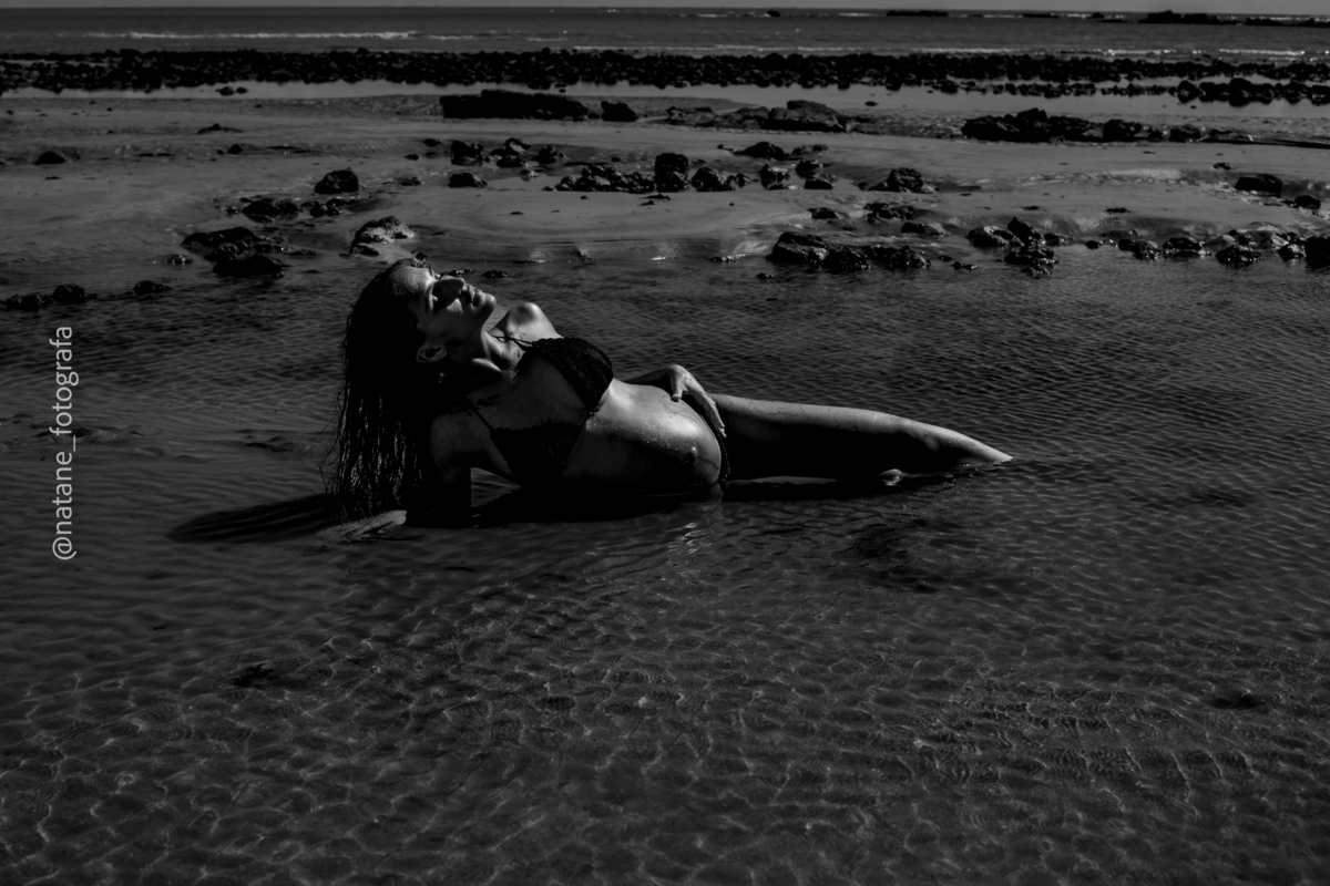 Marcamos o ensaio na praia, e mesmo não sendo exatamente o lugar que ela sonhava, o cenário do Cabo Branco nos presenteou com uma manhã incrível: maré baixa, sol generoso e uma luz perfeita para envolver esse trio, o casal cheio de amor e a pequena Maria, ainda no forninho, mas já tão esperada e querida.